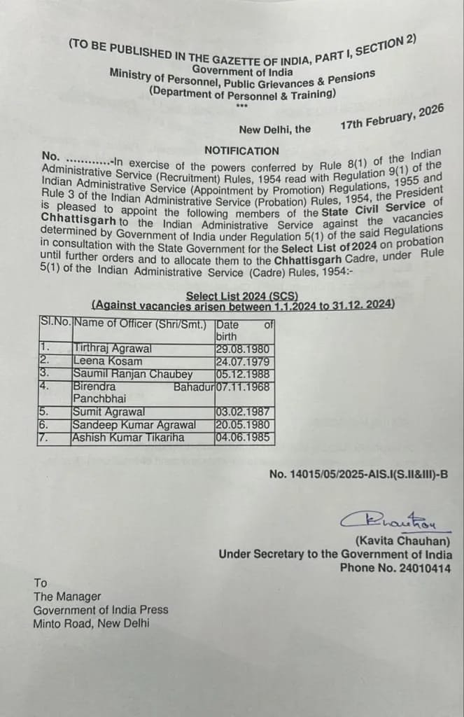 छत्तीसगढ़ प्रदेश के प्रशासनिक ढांचे में आज एक अहम बदलाव हुआ है। कार्मिक एवं प्रशिक्षण विभाग ने वर्ष 2024 की चयन सूची के तहत राज्य सिविल सेवा (CSS) के सात अधिकारियों को भारतीय प्रशासनिक सेवा (IAS) में पदोन्नत करने की आधिकारिक अधिसूचना जारी कर दी है।