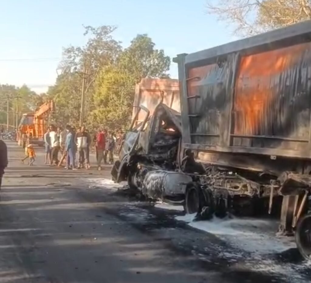 अकलतरा के कोटगढ़ में भीषण सड़क हादसा, तीन ट्रेलर की टक्कर के बाद लगी आग
