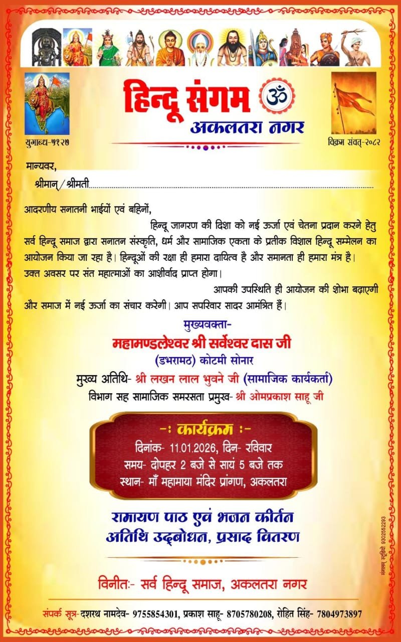 सनातन संस्कृति, धर्म और सामाजिक एकता को सशक्त करने के उद्देश्य से अकलतरा नगर में सर्व हिन्दू समाज के तत्वावधान में विशाल हिन्दू सम्मेलन का आयोजन किया जा रहा है। यह सम्मेलन 11 जनवरी 2026, रविवार को माँ महामाया मंदिर प्रांगण, अकलतरा में दोपहर 2 बजे से सायं 5 बजे तक आयोजित होगा।आयोजकों के अनुसार, यह सम्मेलन हिन्दू जागरण की दिशा में नई ऊर्जा और चेतना प्रदान करने का एक महत्वपूर्ण प्रयास है।