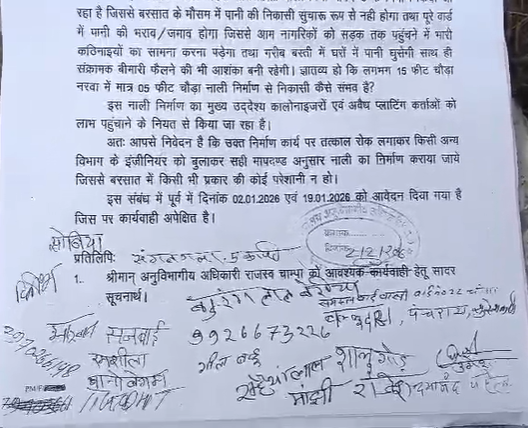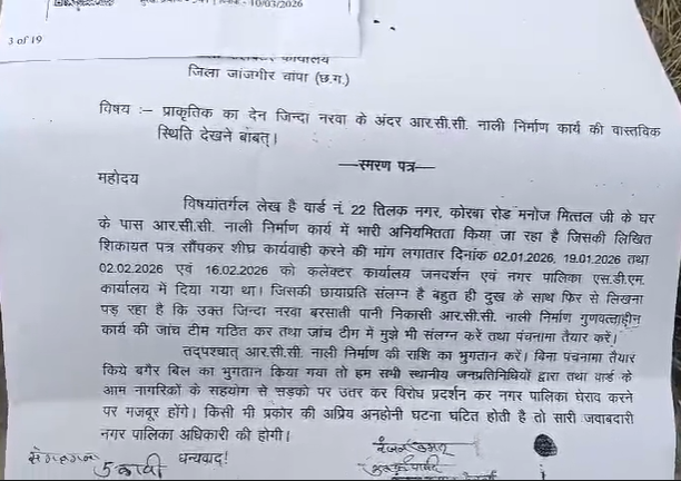 चांपा में आरसीसी नाली निर्माण पर भ्रष्टाचार के आरोप, पूर्व पार्षद ने कलेक्टर से की जांच की मांग