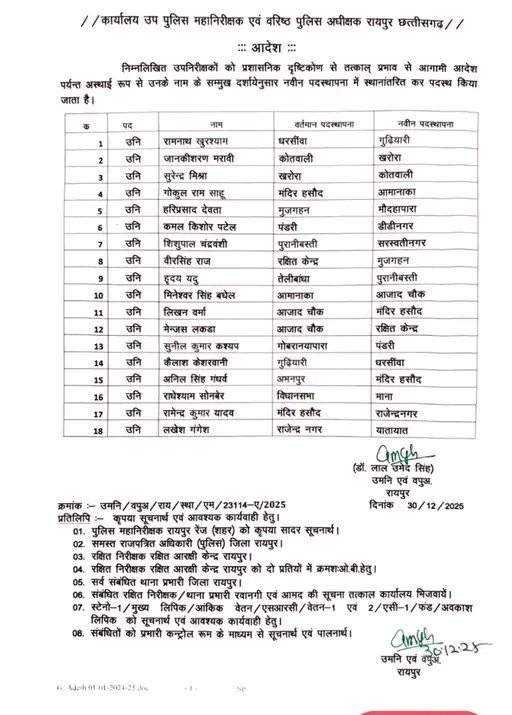 IG और SSP की समीक्षा बैठक के बाद पुलिस विभाग में बड़ा प्रशासनिक बदलाव किया गया है। जारी आदेश के अनुसार कुल 59 पुलिसकर्मियों के कार्यक्षेत्र और जिम्मेदारियों में बदलाव किया गया है। इस ट्रांसफर लिस्ट में 4 थाना प्रभारी (TI), 18 सब इंस्पेक्टर (SI) और 37 असिस्टेंट सब इंस्पेक्टर (ASI) शामिल हैं।
