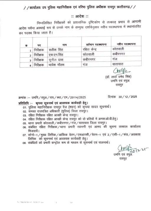 इसके अलावा भावेश गौतम को यातायात विभाग की जिम्मेदारी दी गई है, जबकि इंस्पेक्टर सचिन सिंह को कोतवाली थाना में पदस्थ किया गया है।