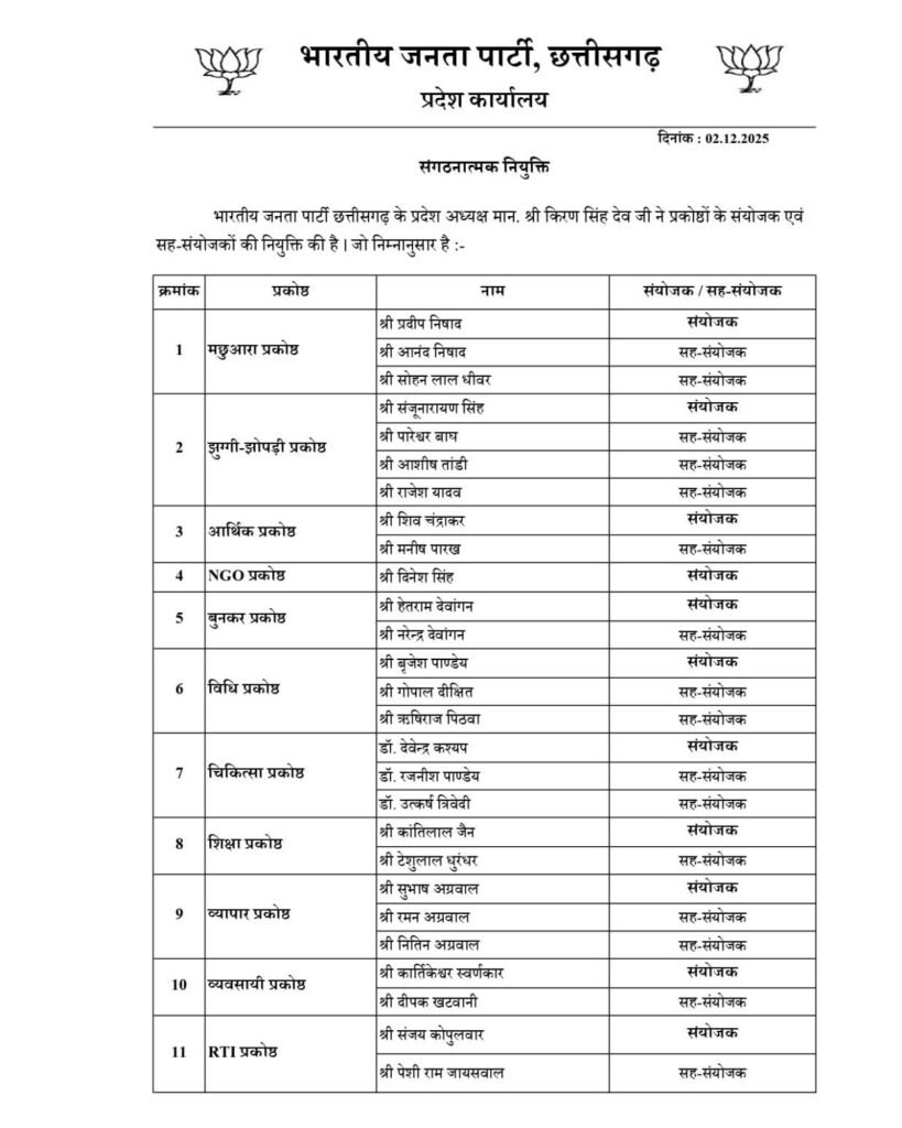 भारतीय जनता पार्टी ने संगठन विस्तार और प्रकोष्ठों के पुनर्गठन के क्रम में शक्ति विधानसभा क्षेत्र के सक्रिय भाजपा नेता एवं पूर्व प्रदेश सह-संयोजक, बुनकर प्रकोष्ठ छत्तीसगढ़, हेतराम देवांगन को बुनकर प्रकोष्ठ का प्रदेश संयोजक नियुक्त किया है। उनकी नियुक्ति की घोषणा भाजपा संगठन महामंत्री पवन साय ने प्रदेश अध्यक्ष किरण देव सिंह की अनुमति एवं समिति की अनुशंसा से की। इस निर्णय के बाद पूरे क्षेत्र में उत्साह और हर्ष का वातावरण है।