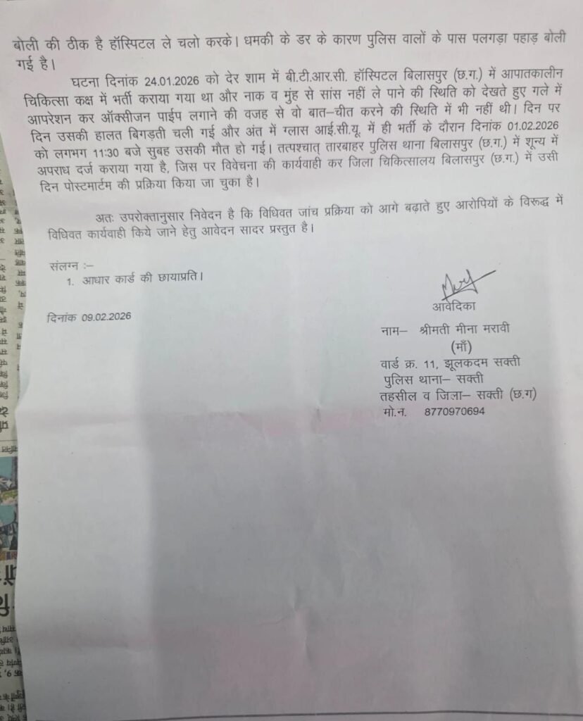इसके अलावा 23 और 24 जनवरी की कथित वायरल चैट्स में आपसी विवाद के संकेत मिलने की बात कही जा रही है, जिससे मामले ने और तूल पकड़ लिया है। मृतिका की मां मीना मरावी ने सक्ती थाना में नामजद शिकायत दर्ज कराई है। पुलिस ने हत्या का मामला कायम कर लिया है और परिजनों ने आरोपियों पर सख्त से सख्त कार्रवाई की मांग की है।