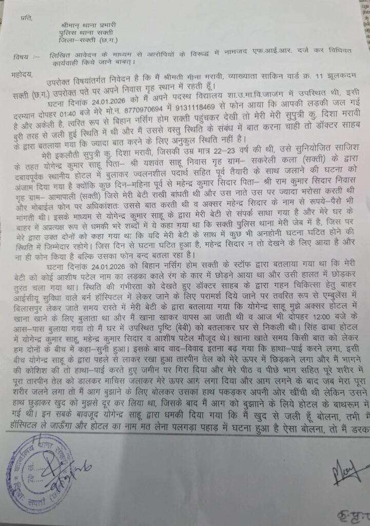 सक्ती से एक बेहद सनसनीखेज मामला सामने आया है, जहां एक युवती को जिंदा जलाने के गंभीर आरोप लगे हैं। यह कथित वारदात 24 जनवरी की बताई जा रही है, जो सक्ती के शिवम होटल में हुई। मृतिका की मां ने आरोप लगाया है कि उनकी बेटी दिशा मरावी को होटल में बुलाकर उस पर तारपीन तेल डाला गया और फिर आग के हवाले कर दिया गया।