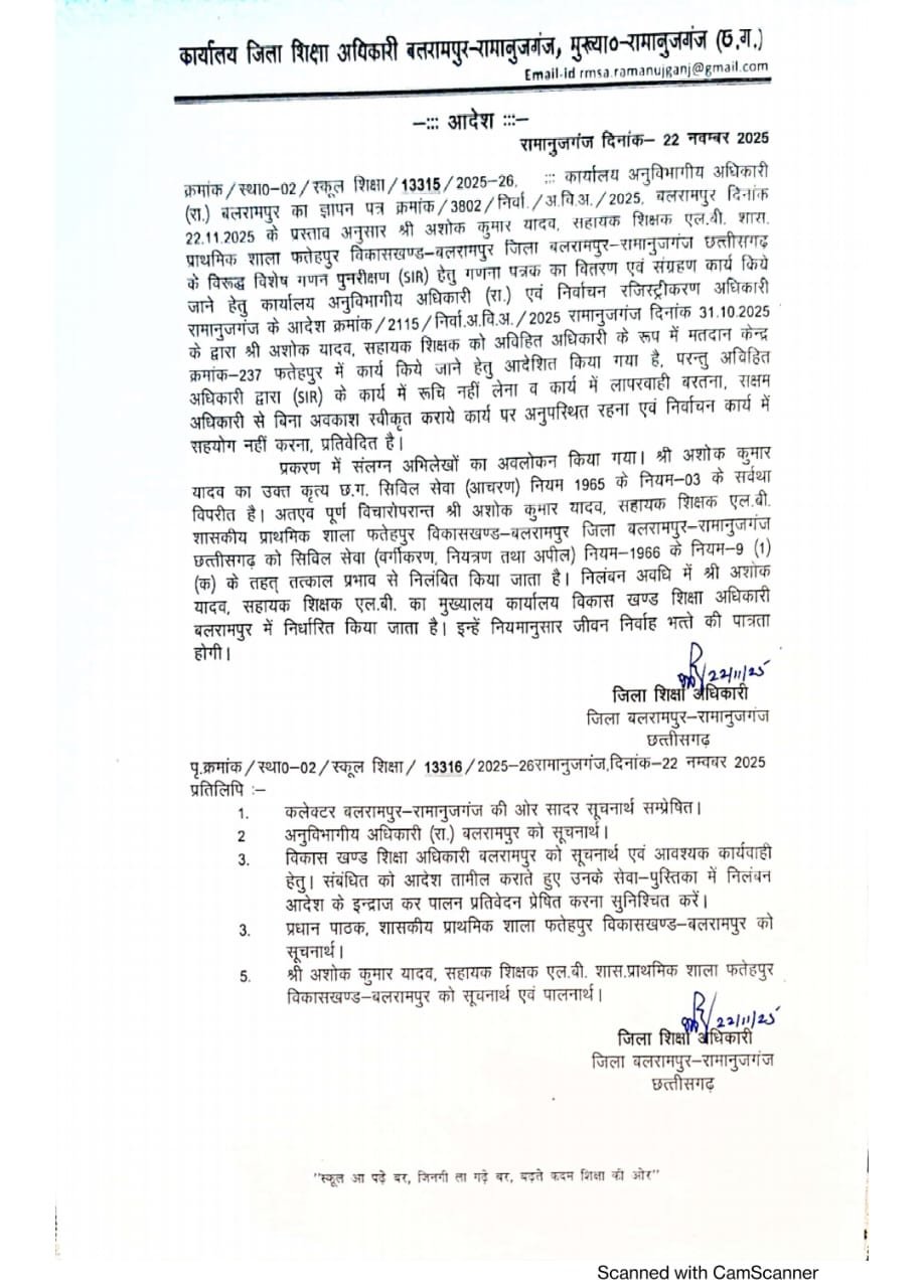 जानकारी के अनुसार, शिक्षक अशोक यादव को निर्वाचन से जुड़े SIR कार्य, विशेष रूप से गणना पत्रों के वितरण एवं संग्रहण की जिम्मेदारी सौंपी गई थी। लेकिन कार्य के दौरान गंभीर लापरवाही सामने आने पर जिला शिक्षा अधिकारी मनीराम यादव ने तत्काल प्रभाव से निलंबन की कार्रवाई की है।
