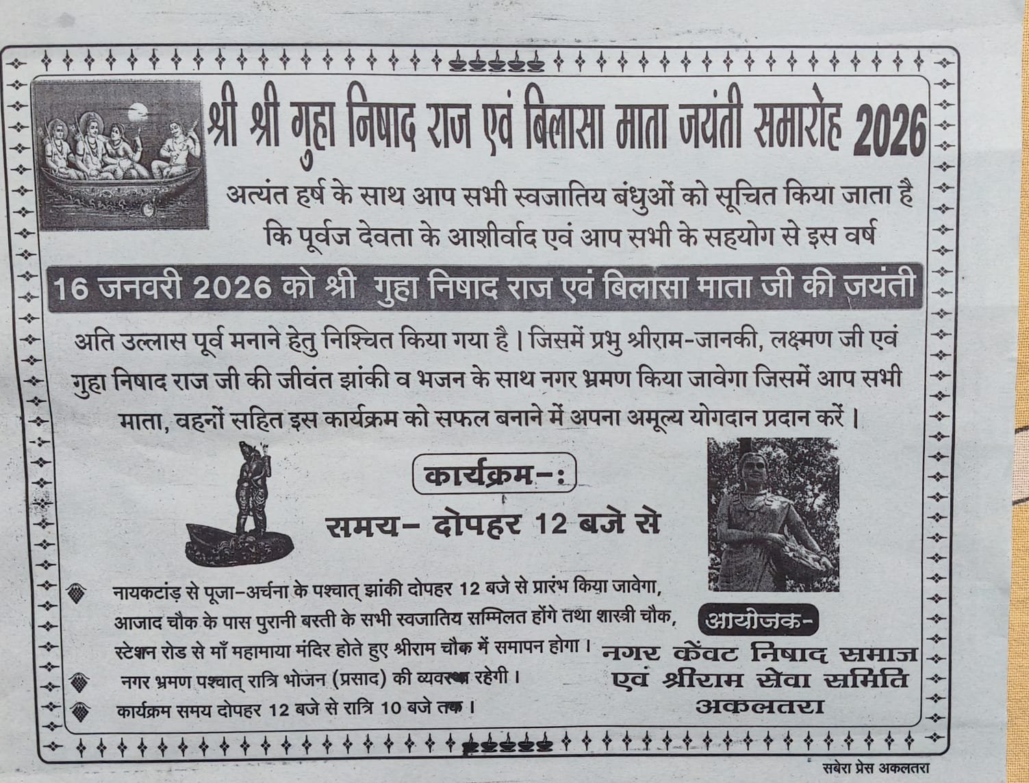 अकलतरा नगर में आगामी 16 जनवरी 2026 को श्री श्री गुहा निषाद राज एवं बिलासा माता जयंती समारोह हर्षोल्लास और श्रद्धा के साथ मनाया जाएगा। यह आयोजन नगर केंवट निषाद समाज एवं श्रीराम सेवा समिति अकलतरा के संयुक्त तत्वावधान में किया जा रहा है।