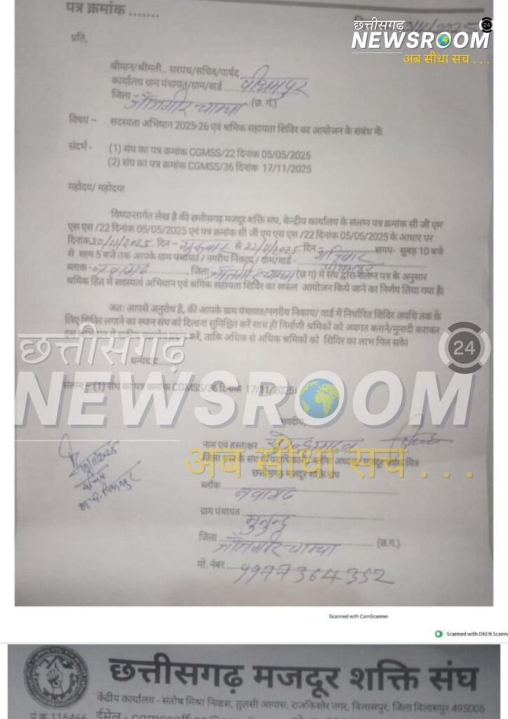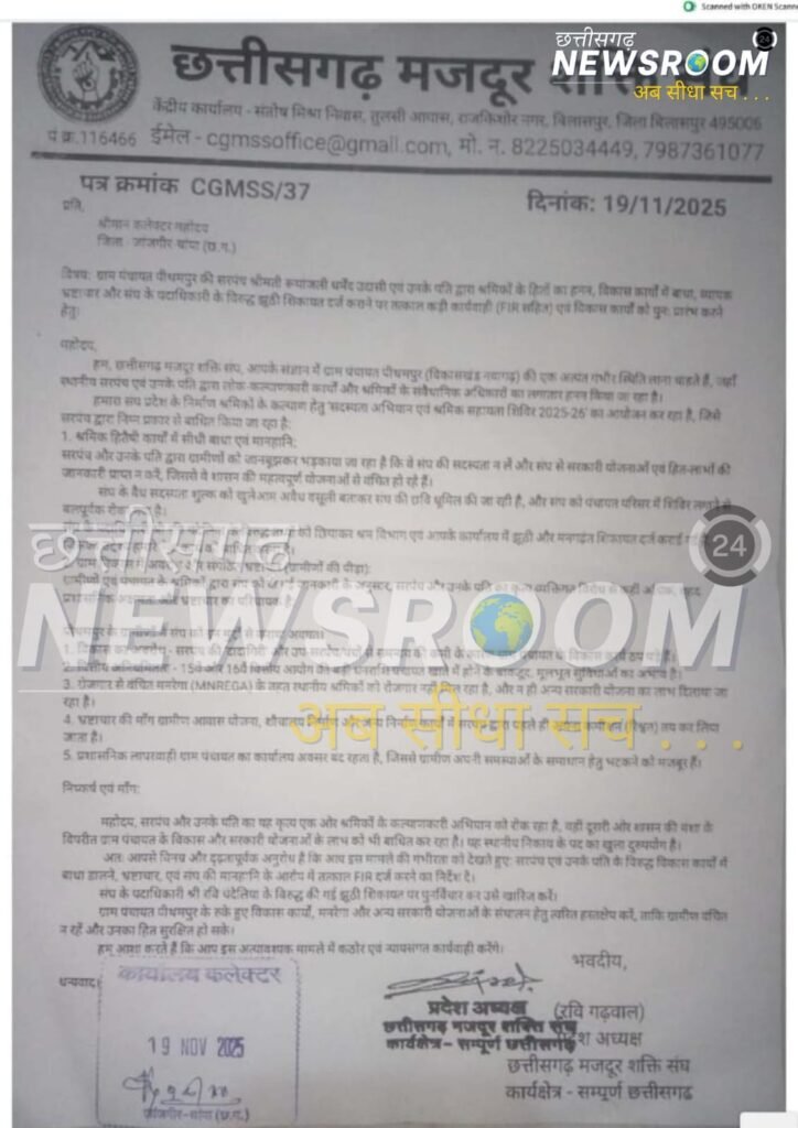 छत्तीसगढ़ मजदूर शक्ति संघ ने बताया कि उनके ‘सदस्यता अभियान एवं श्रमिक सहायता शिविर 2025-26’ में सरपंच और उनके पति लगातार बाधा डाल रहे हैं।