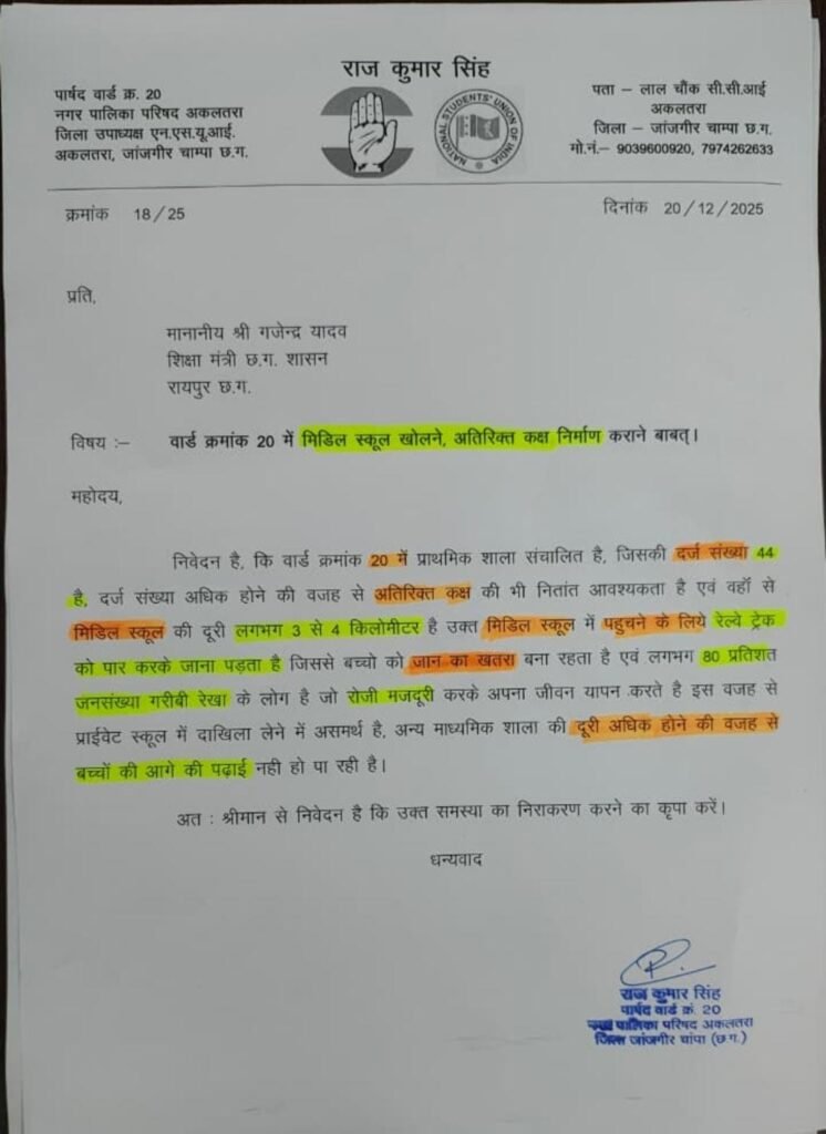 राज सिंह ने शिक्षा मंत्री से मांग की कि वार्ड क्रमांक 20 में प्राथमिक शाला में अतिरिक्त कक्ष की स्वीकृति दी जाए और बच्चों की सुरक्षा व शिक्षा को ध्यान में रखते हुए मिडिल स्कूल की व्यवस्था वार्ड के भीतर या नजदीकी सुरक्षित स्थान पर की जाए। उन्होंने कहा कि यदि समय रहते इन मांगों पर ध्यान नहीं दिया गया, तो क्षेत्र के कई बच्चे शिक्षा से वंचित रह जाएंगे।