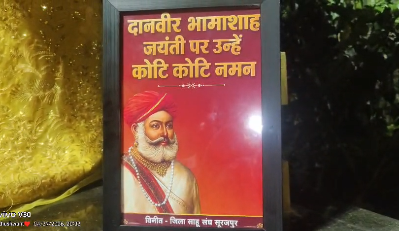 29 अप्रैल 2026 को सूरजपुर जिले में साहू समाज के तत्वावधान में दानवीर भामाशाह जयंती बड़े ही हर्षोल्लास के साथ मनाई गई। कार्यक्रम का आयोजन माता कर्मा चौक में किया गया, जहां सर्वप्रथम माता कर्मा की आरती कर कार्यक्रम की शुरुआत हुई।