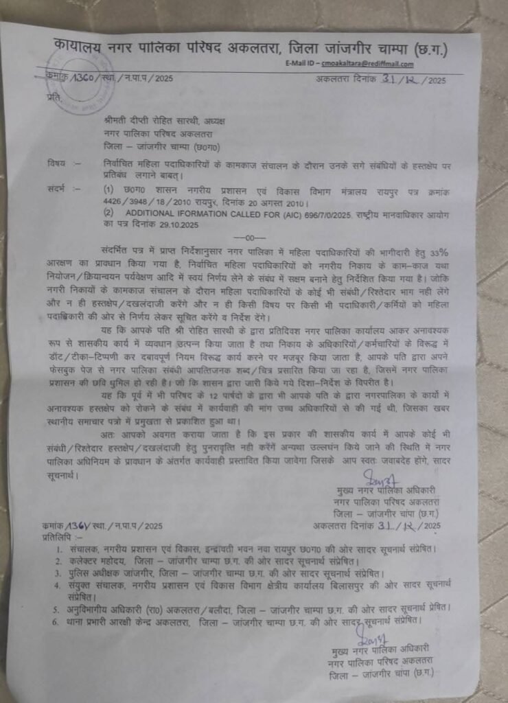 गौरतलब है कि बीते कुछ समय से अकलतरा नगर पालिका में अध्यक्ष और सीएमओ के बीच लगातार टकराव देखने को मिल रहा है। यह धरना प्रदर्शन उसी टकराव की एक और कड़ी माना जा रहा है, जिसने नगर पालिका की कार्यप्रणाली और विकास कार्यों पर सवाल खड़े कर दिए हैं। और अध्यक्ष के द्वारा सीएमओ के मनमाने रवैया से नगर के विकास कार्यों में बाधा उत्पन होने की बात कही गई ।