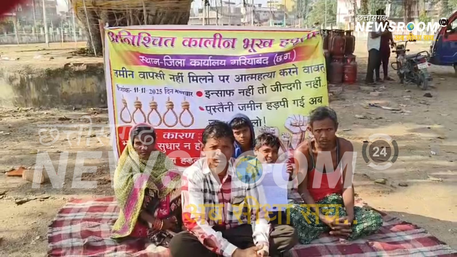 गरियाबंद में कड़कड़ाती ठंड के बीच खरी पथरा गांव के किसान मुरहा नागेश अपने पूरे परिवार के साथ गांधी मैदान में भूख हड़ताल पर बैठे हैं। मुरहा नागेश का कहना है कि वह अपनी ही पुश्तैनी जमीन के मालिकाना हक के लिए संघर्ष कर रहे हैं, लेकिन प्रशासनिक उदासीनता के कारण अब तक न्याय नहीं मिला।