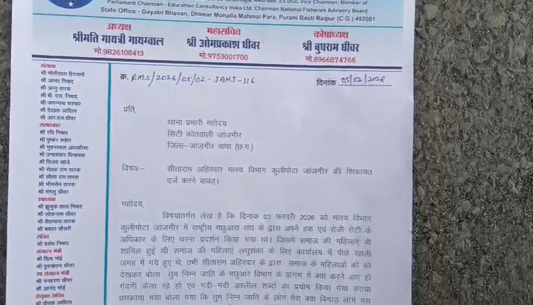 जांजगीर से एक गंभीर मामला सामने आया है, जहां राष्ट्रीय मछुआरा संघ छत्तीसगढ़ के बैनर तले बड़ी संख्या में महिलाएं और पुरुष एसपी कार्यालय पहुंचे और मत्स्य विभाग के एक कर्मचारी पर महिलाओं से जातिगत गाली-गलौज करने का गंभीर आरोप लगाया है। संघ के सदस्यों ने पुलिस अधीक्षक को लिखित शिकायत सौंपते हुए मामले में सख्त कार्रवाई की मांग की है।