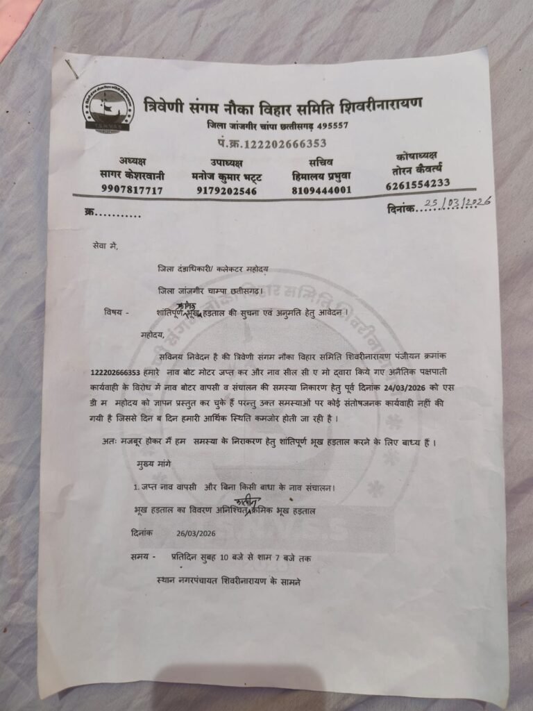 धार्मिक नगरी शिवरीनारायण में सुशासन के दावों की हकीकत सवालों के घेरे में है। यहां गरीब नाविक अपनी रोजी-रोटी बचाने के लिए भूख हड़ताल पर बैठने को मजबूर हैं। आरोप है कि नगर पंचायत द्वारा सफाई टैक्स के नाम पर नाविकों की कमाई का 20 प्रतिशत हिस्सा वसूला जा रहा है, वहीं कुछ नावों को जब्त भी कर लिया गया है।