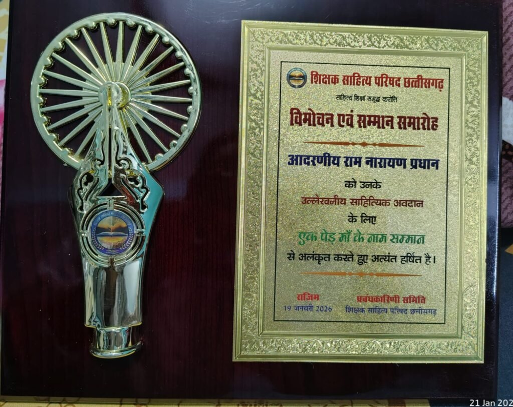 यह सम्मान शिक्षक कला साहित्य परिषद छत्तीसगढ़ के तत्वावधान में आयोजित “एक पेड़ मां के नाम” अखिल भारतीय कविता लेखन प्रतियोगिता में उत्कृष्ट रचना के लिए प्रदान किया गया।