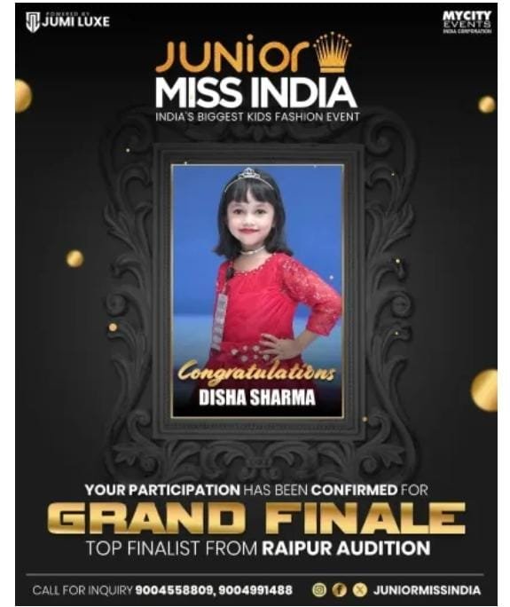 छत्तीसगढ़ की राजधानी रायपुर की रहने वाली 6 वर्षीया बालिका दिशा ने प्रदेश का नाम राष्ट्रीय स्तर पर रोशन किया है। दिशा का चयन मिस इंडिया ग्रैंड फिनाले प्रतियोगिता के टॉप-9 फाइनलिस्ट के रूप में हुआ है, जो न केवल उनके परिवार बल्कि पूरे छत्तीसगढ़ के लिए गर्व की बात है।