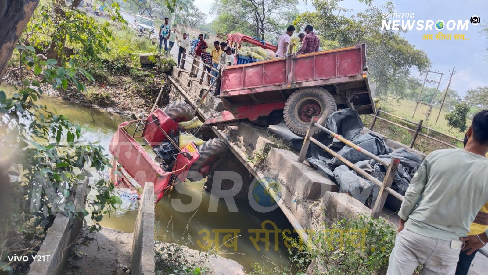 जिले के चांपा जांजगीर मुख्य मार्ग के लचनपुर चौक के समीप में आज दोपहर 2 बजे एक तेज रफ्तार ट्रैक्टर हादसे का शिकार हो गया। चांपा से जांजगीर की ओर जा रहा सीमेंट से भरा ट्रैक्टर अचानक अनियंत्रित होकर सड़क किनारे की रेलिंग तोड़ते हुए सीधे नाले में जा घुसा। हादसा इतना जोरदार था कि ट्रैक्टर का अगला हिस्सा बुरी तरह क्षतिग्रस्त हो गया, जबकि रेलिंग पूरी तरह टूटकर बिखर गई।