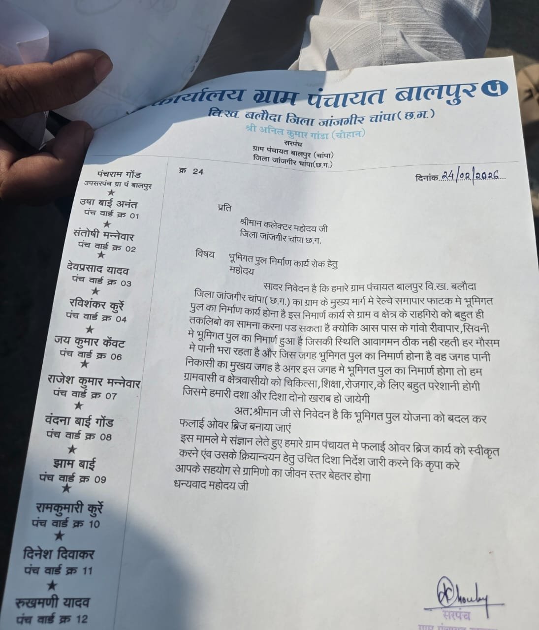 अंडरब्रिज नहीं, ओवरब्रिज चाहिए: जलभराव के डर से लामबंद हुए बालपुर के ग्रामीण, कलेक्टर को सौंपा ज्ञापन