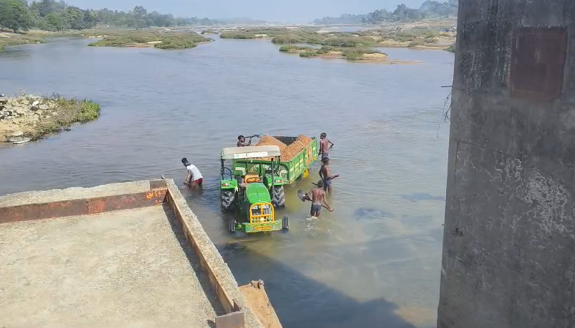हसदेव नदी से बिना अनुमति, बिना रॉयल्टी और बिना डर रोज़ाना सैकड़ों ट्रैक्टर रेत भरकर निकल रहे हैं।