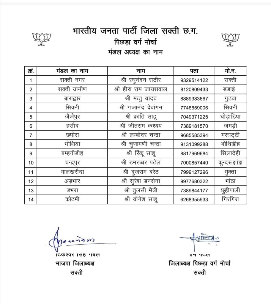 भारतीय जनता पार्टी पिछड़ा वर्ग मोर्चा जिला सक्ती द्वारा संगठन विस्तार के तहत मंडल अध्यक्षों की सूची जारी की गई है। इस सूची में चांपा के समीप स्थित सिवनी गांव निवासी गजानंद देवांगन को सिवनी मंडल अध्यक्ष की जिम्मेदारी सौंपी गई है। नियुक्ति की खबर सामने आते ही क्षेत्र के कार्यकर्ताओं और समर्थकों में उत्साह का माहौल देखा गया।