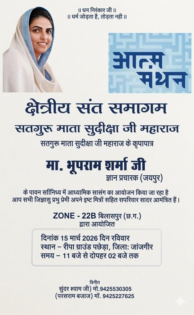 कार्यक्रम में जयपुर से महात्मा भूपराम शर्मा, ज्ञान प्रचारक एवं संयोजक तथा बिलासपुर जोन-22 के महात्मा श्याम सुन्दर की उपस्थिति में क्षेत्रीय समागम आयोजित होगा। इस समागम में बिलासपुर, चकरभाटा, कोरबा, जमनीपाली, गुरुदेवा, कटघोरा, पथलगांव, खमिया, उद्देकेरा, जैजैपुर, मधाईपुर, नवागढ़, अकलतरा, चाम्पा और जांजगीर ब्रांच के श्रद्धालु शामिल होंगे।