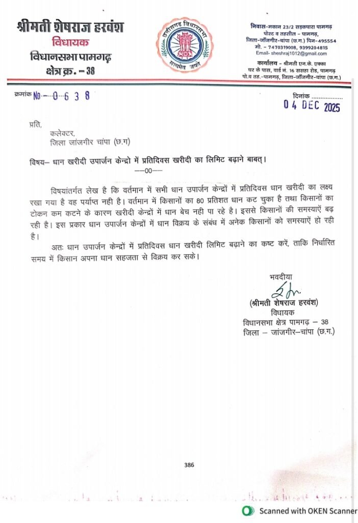 पामगढ़ विधायक शेषराज हरवंश ने कलेक्टर से मांग की है कि वर्तमान में सभी धान उपार्जन केन्द्रों में प्रति दिवस धान खरीदी का लक्ष्य रखा गया है वह पर्याप्त नही है। वर्तमान में किसानों का 80 प्रतिशत धान कट चुका है तथा किसानों का टोकन कम कटने के कारण खरीदी केन्द्रों में धान बेच नही पा रहे है। इससे किसानों की समस्याएँ बढ़ रही है। इस प्रकार धान उपार्जन केन्द्रों में धान विक्रय के संबंध में अनेक किसानों को समस्याएँ हो रही है।