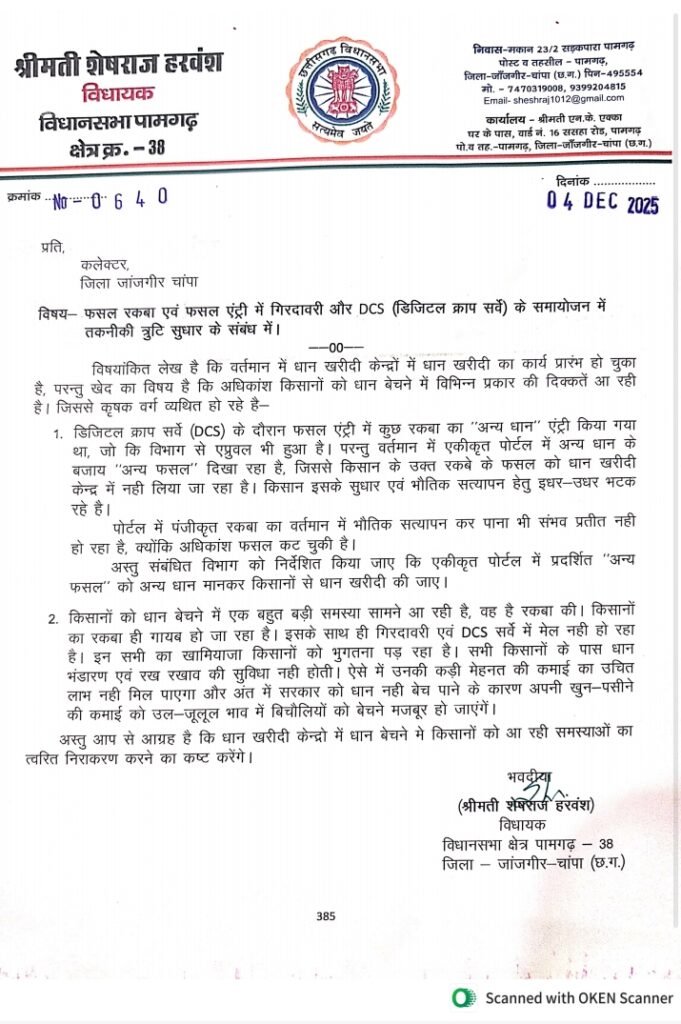 पामगढ़ विधायक श्रीमती शेषराज हरवंश ने धान खरीदी केन्द्रो में धान बेचने में किसानों को फसल रकबा एवं फसल एंट्री में गिरदावरी और डिजिटल क्राप सर्वे (डीजीएस) के समायोजन में तकनीकी त्रुटि सुधार के लिए कलेक्टर को पत्र लिखकर किसानों को आ रही समस्याओं का त्वरित निराकरण करने की मांग की है।