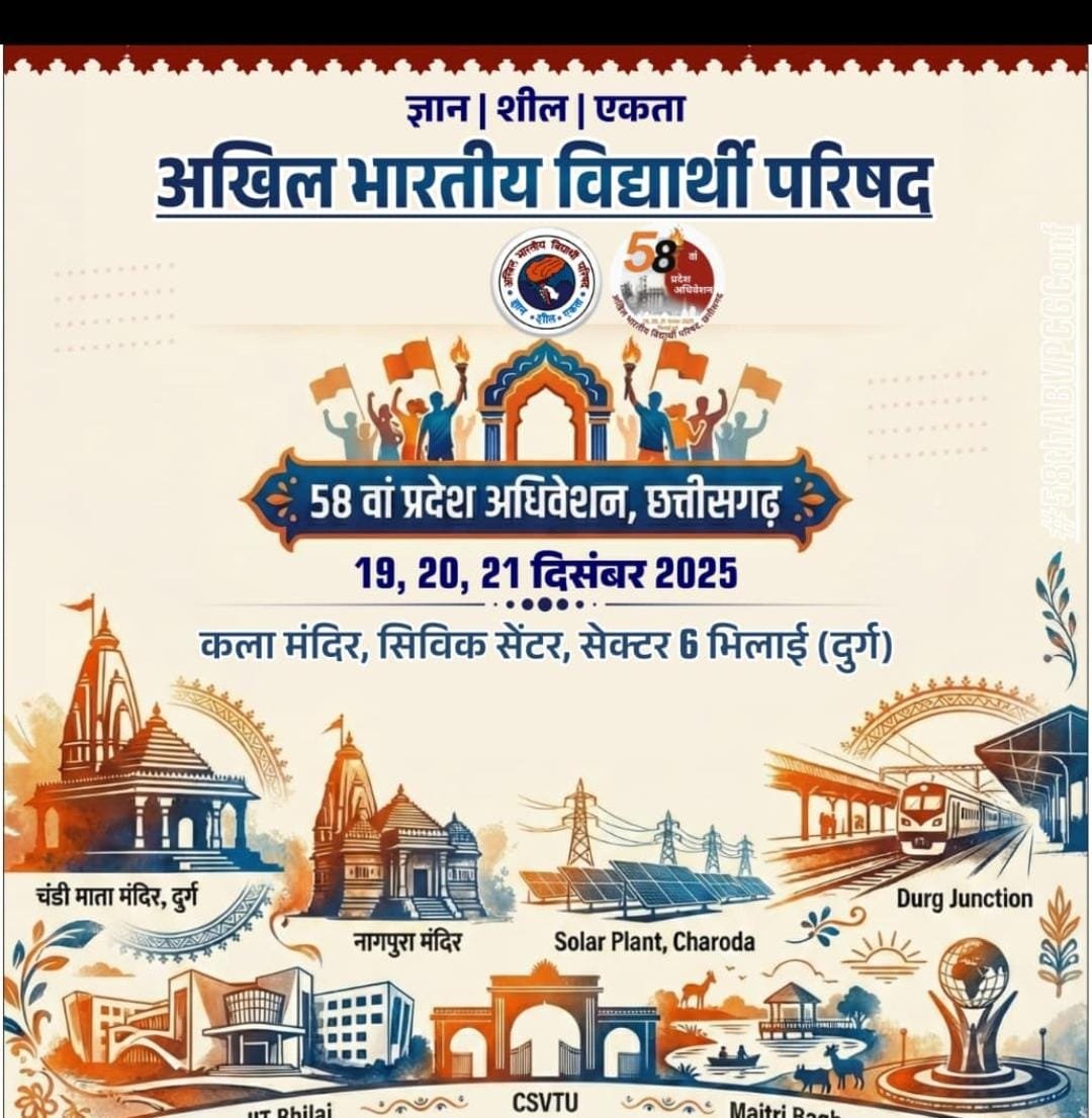 अखिल भारतीय विद्यार्थी परिषद (एबीवीपी) का प्रांतीय अधिवेशन आगामी 19 से 21 दिसंबर तक दुर्ग के कला मंदिर में आयोजित किया जाएगा। तीन दिवसीय इस महत्वपूर्ण कार्यक्रम को लेकर विधिवत भूमिपूजन संपन्न हुआ, जिसके साथ ही अधिवेशन की तैयारियों का औपचारिक शुभारंभ हो गया है। भूमिपूजन कार्यक्रम में एबीवीपी के पदाधिकारी, कार्यकर्ता और आयोजन समिति के सदस्य उपस्थित रहे।