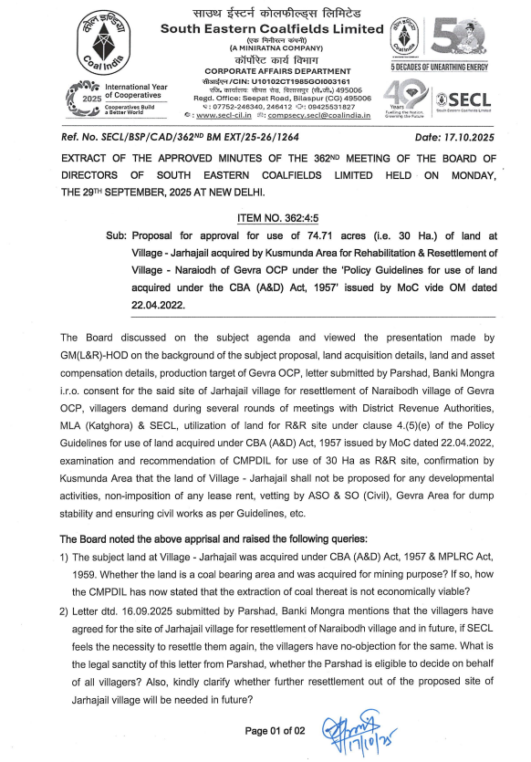 SECL बोर्ड द्वारा नरईबोध विस्थापितों के लिए जरहाजेल में पुनर्वास स्थल (R&R Site) को मंजूरी
