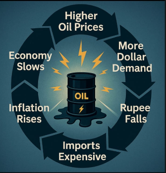 भारत कच्चे तेल का बड़ा आयातक है। अंतरराष्ट्रीय बाजार में तेल की कीमतें बढ़ने पर आयात महंगा होता है, जिससे रुपये पर दबाव बनता है।