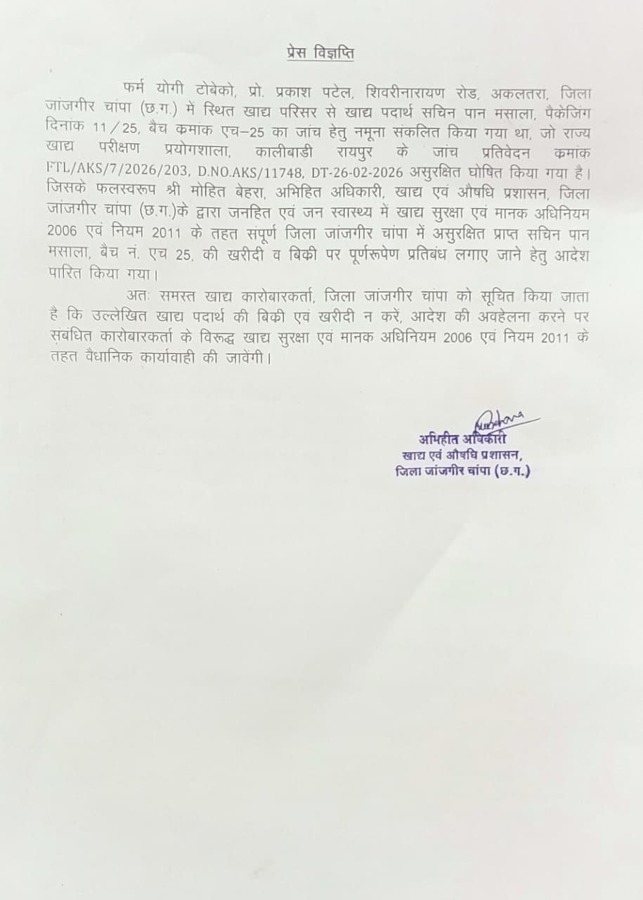 खाद्य सुरक्षा विभाग से मिली जानकारी के अनुसार अकलतरा स्थित फर्म योगी टोबेको, प्रो. प्रकाश पटेल, शिवरीनारायण रोड के खाद्य परिसर से सचिन पान मसाला (बैच नंबर एच-25, पैकेजिंग दिनांक 11/25) का नमूना जांच के लिए लिया गया था।