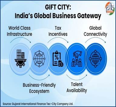 गांधीनगर, गुजरात स्थित GIFT City भारत का पहला International Financial Services Centre (IFSC) है। इसे भविष्य की वित्तीय जरूरतों को ध्यान में रखकर डिजाइन किया गया है, जहाँ—