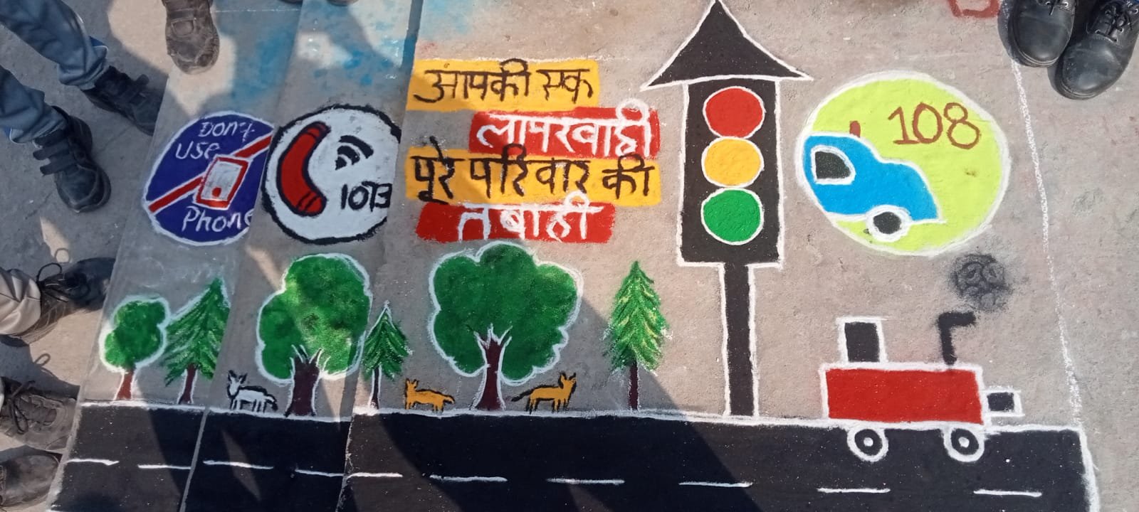 कार्यक्रम के दौरान छात्र-छात्राओं ने सड़क सुरक्षा की थीम पर बेहद आकर्षक और रचनात्मक रंगोली बनाकर हेलमेट, सीट बेल्ट, ट्रैफिक सिग्नल और सुरक्षित सड़क पार करने जैसे महत्वपूर्ण संदेशों को चित्रों के माध्यम से प्रस्तुत किया।