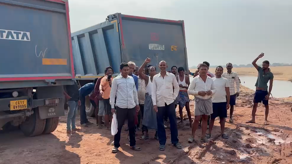 ग्रामीणों ने नदी में पहुंचकर चैन माउंटेन मशीनों को घेर लिया और रेत परिवहन कर रहे हाइवा वाहनों को रोक दिया।