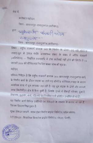 बलरामपुर जिले के ग्राम जमान्तपुर में आज हालात तनावपूर्ण हो सकते हैं। राष्ट्रीय राजमार्ग 343 पर निर्माण कार्य से उड़ती भारी धूल और काम की धीमी रफ्तार से परेशान ग्रामीणों ने आज चक्का जाम का ऐलान किया है। ग्रामीणों का कहना है कि सड़क निर्माण के दौरान न तो नियमित पानी का छिड़काव किया जा रहा है और न ही निर्माण कार्य में अपेक्षित तेजी दिखाई दे रही है।